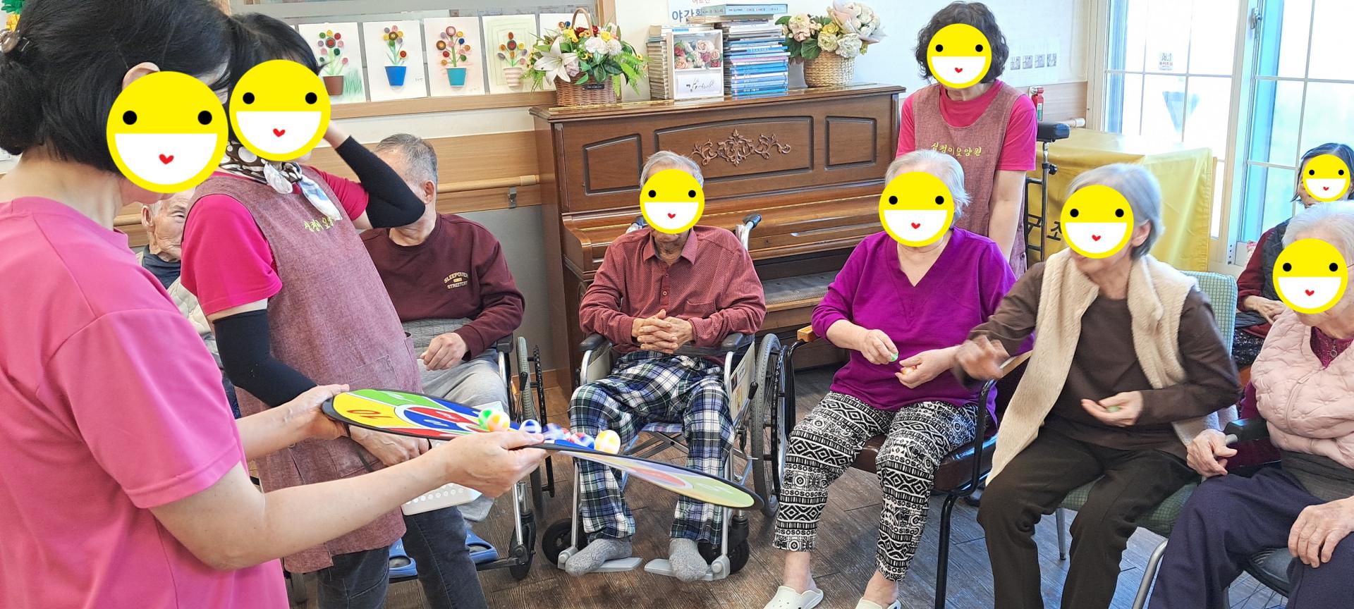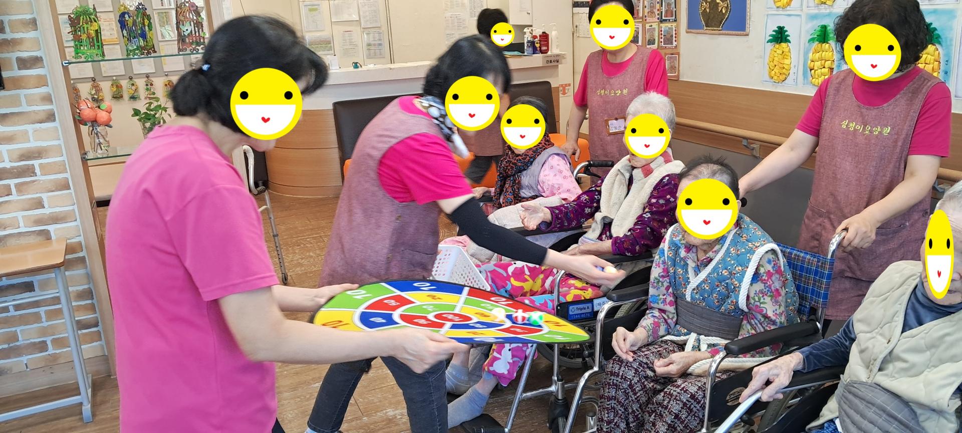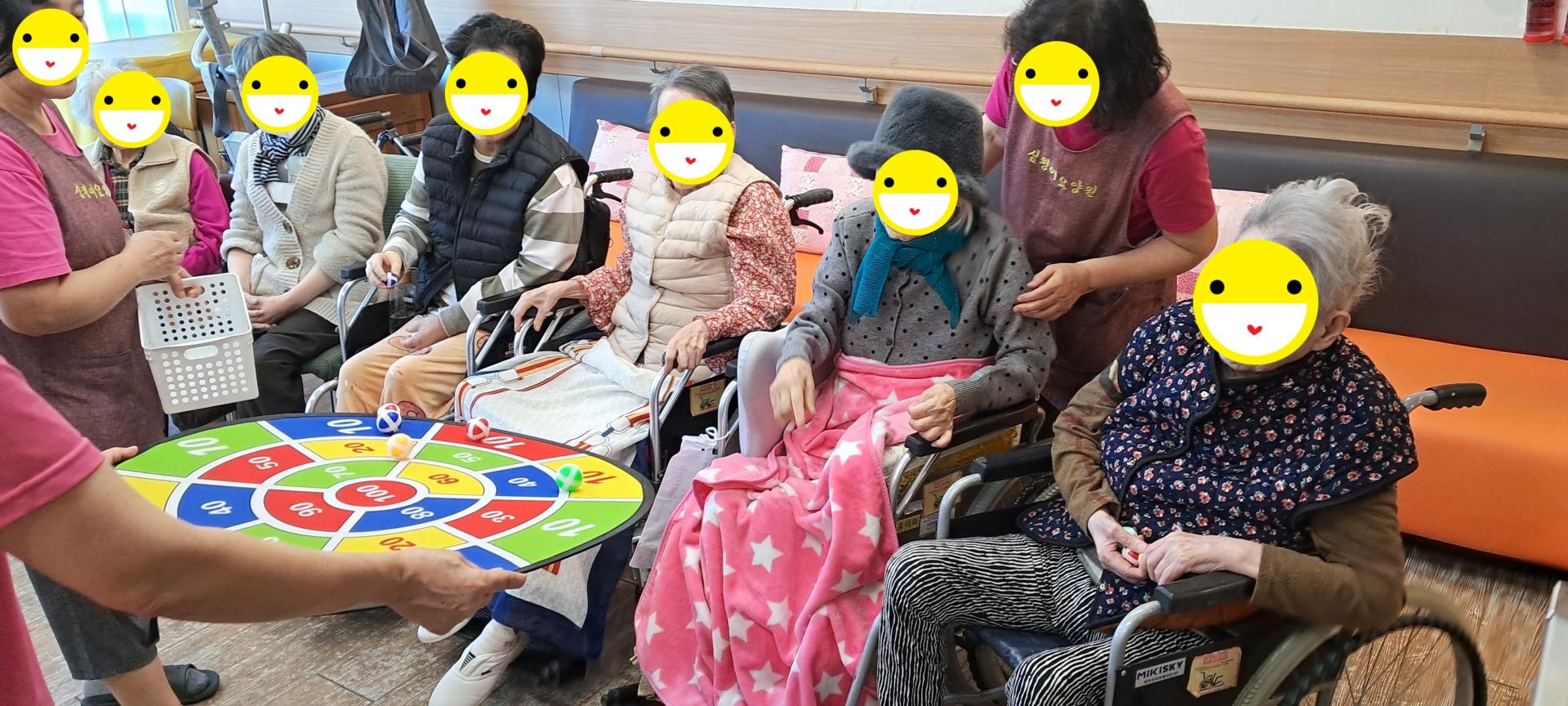 오늘은 어르신들과 인지프로그램과 여가프로그램을 같이 실시하였습니다. 먼저 어르신들과 스트레칭을 하고난 후 사방방향 박수게임과 신체부위 색깔 박수게임을 하고, 이어서 동그란 찍찍이 과녁에 볼을 던져서 100점에 가장 근접 시켜 보시도록 게임을 해 보았습니다. 어르신들의 순발력 집중력 향상과 소근육활동을 해보는 시간이었습니다.