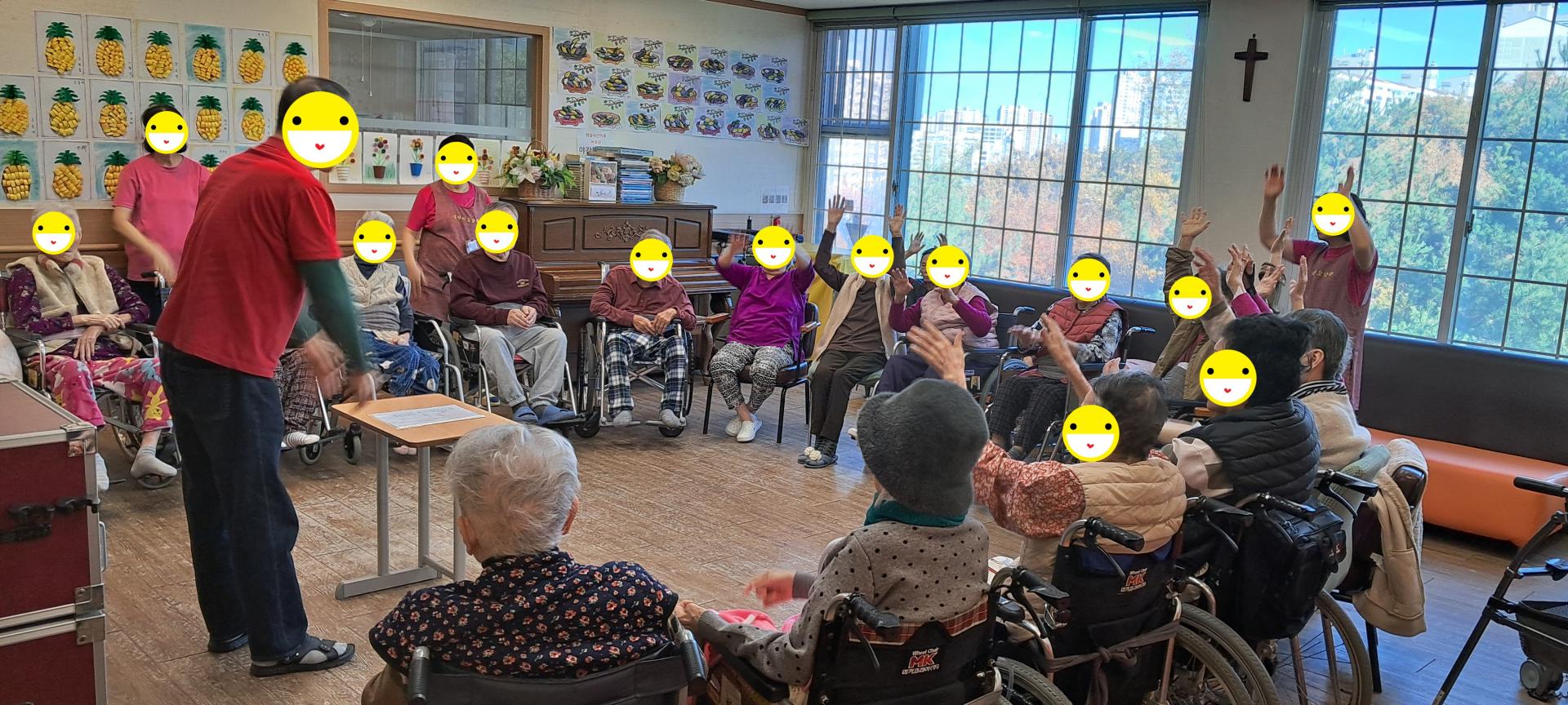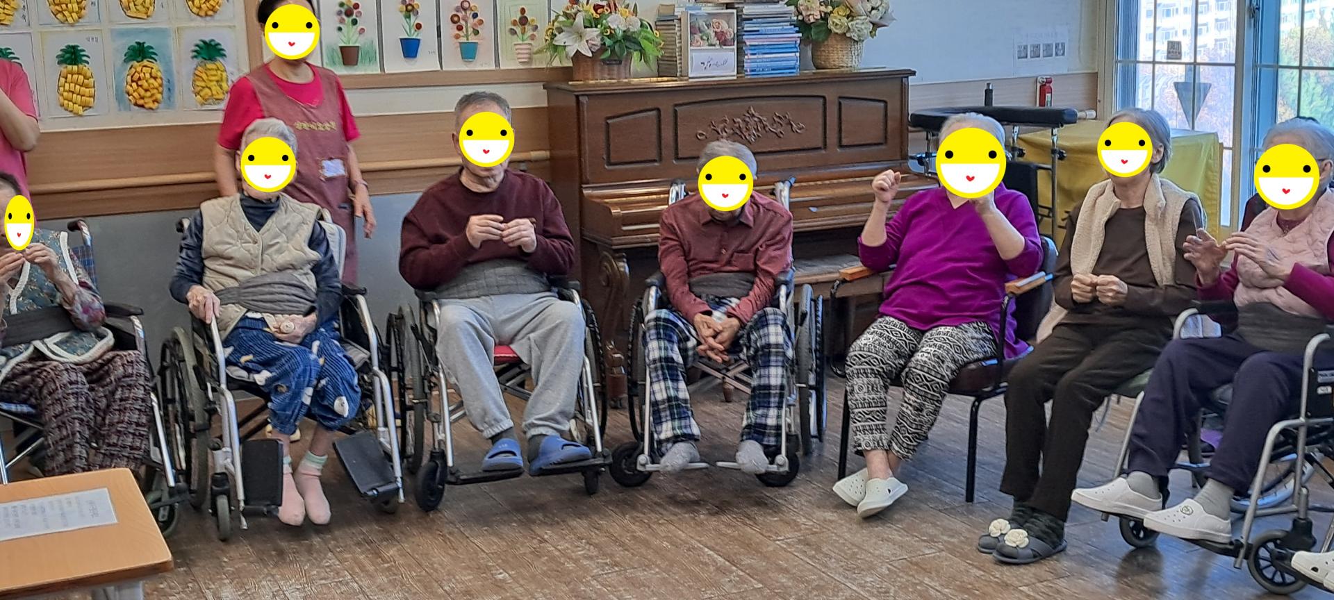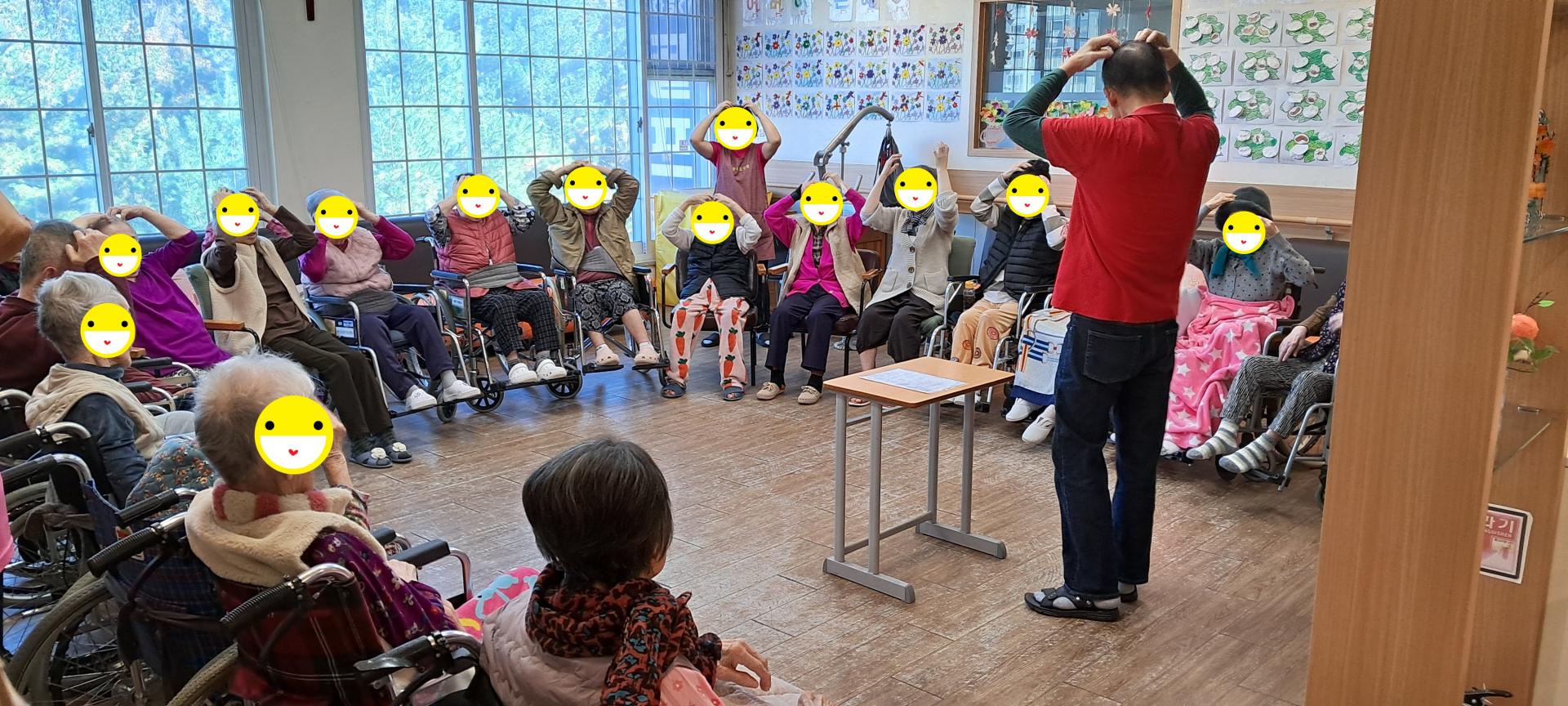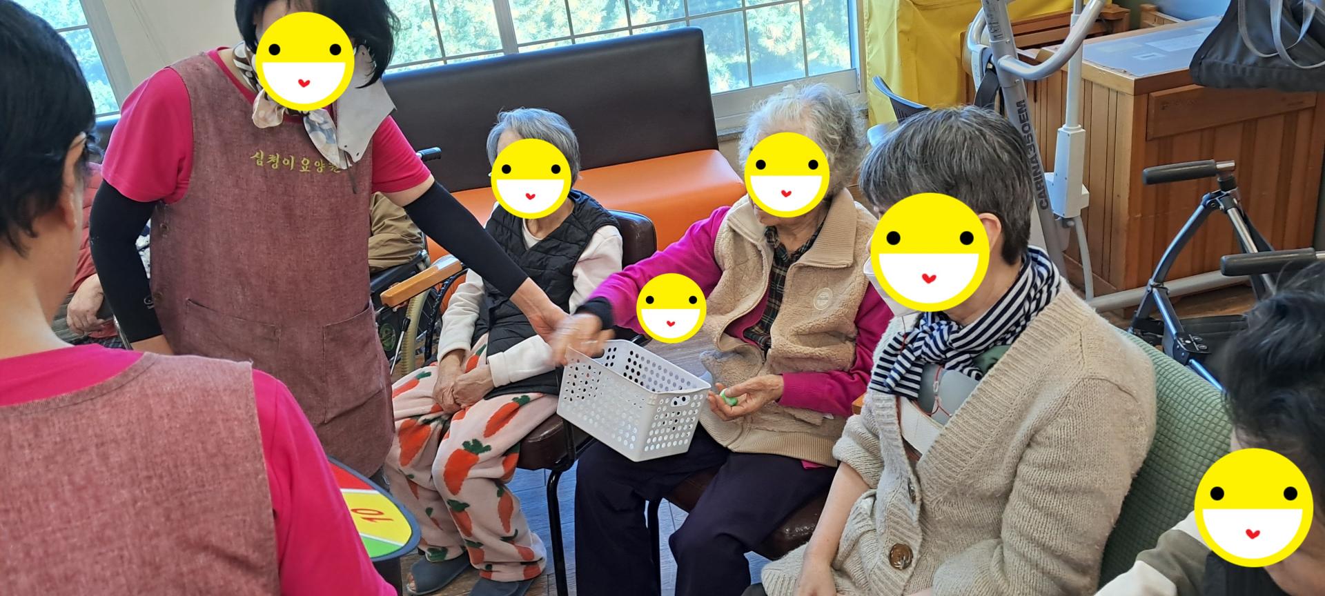 오늘은 어르신들과 인지프로그램과 여가프로그램을 같이 실시하였습니다. 먼저 어르신들과 스트레칭을 하고난 후 사방방향 박수게임과 신체부위 색깔 박수게임을 하고, 이어서 동그란 찍찍이 과녁에 볼을 던져서 100점에 가장 근접 시켜 보시도록 게임을 해 보았습니다. 어르신들의 순발력 집중력 향상과 소근육활동을 해보는 시간이었습니다.
