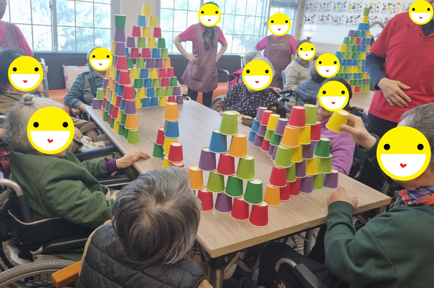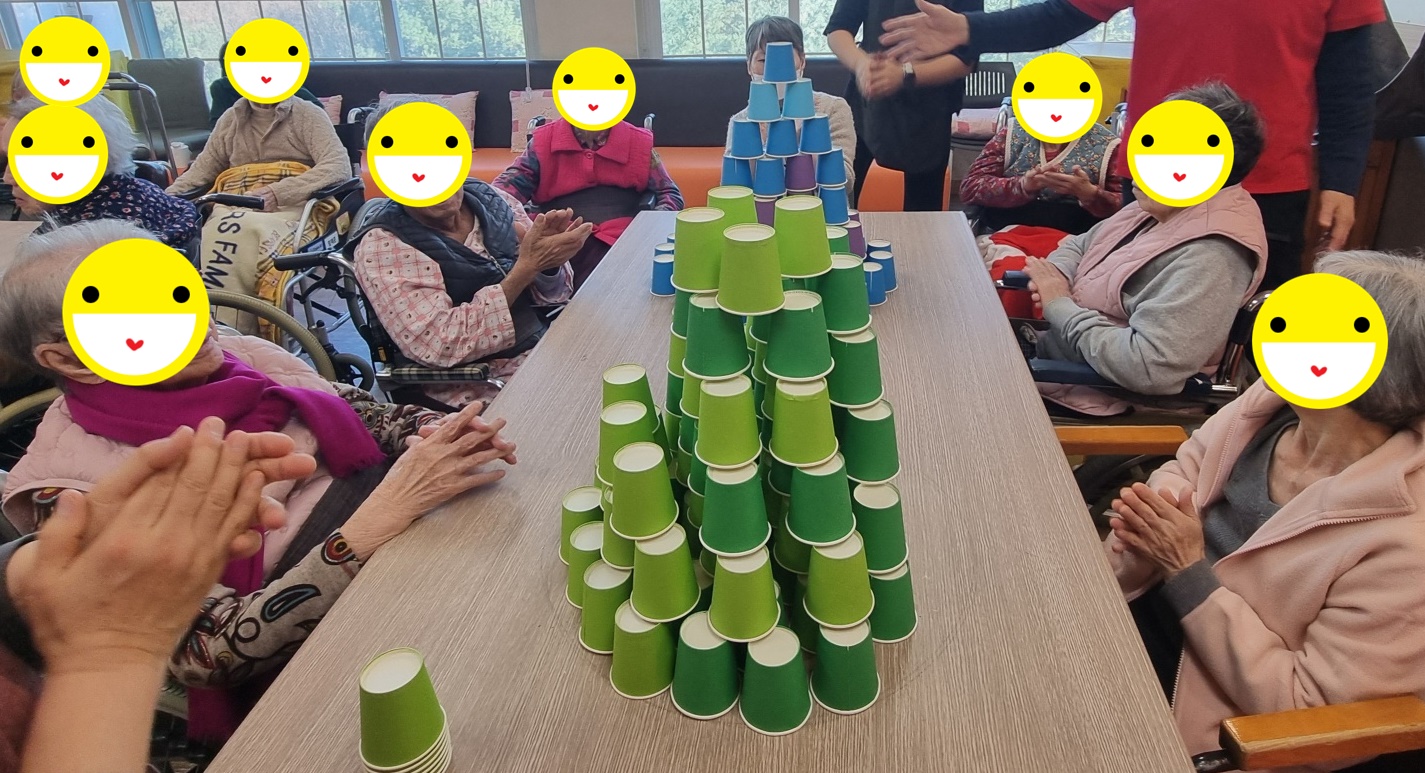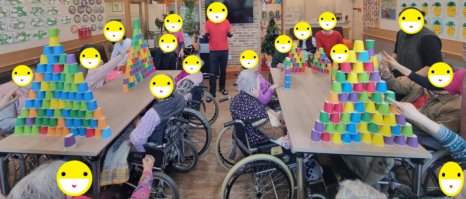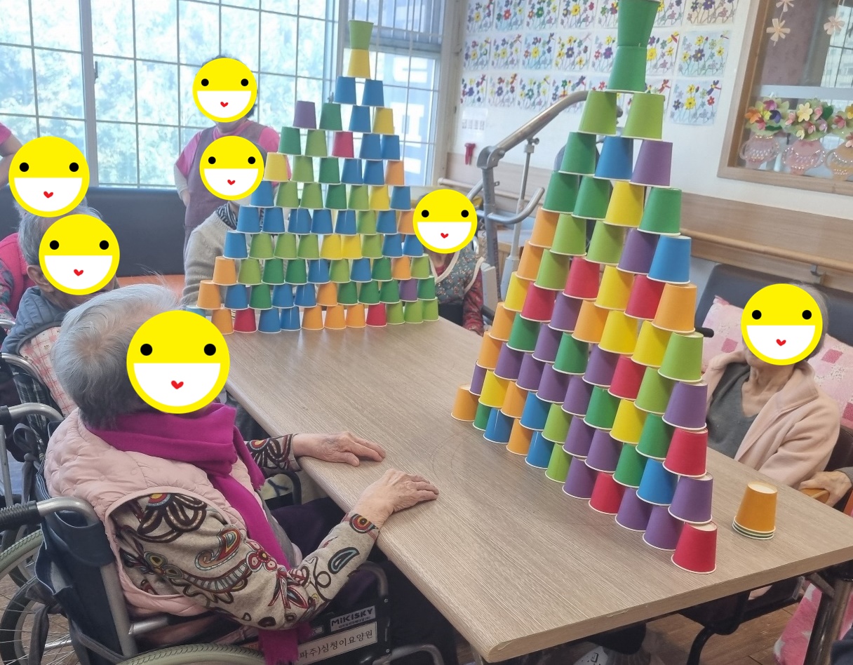 오늘은 인지놀이와 여가활동을 같이 실시하였습니다. 곰발4개 새발2개를 연습한 후 찔레꽃 노래에 맞추어 노래와 박수놀이를 같이 해 보면서 인지기능을 활성화 해 보았습니다. 여가활동으로는 형형색색 종이컵을 어느팀이 가장 높이 쌓아 올리는지 시합을 해 보고 이어서 동그라미 안쪽으로 컵을 배열하는데 가장 예쁘게 배열하도록 해서 가장 예쁘게 배열한 어르신 팀에는 환호와 박수 보내 드렸습니다.